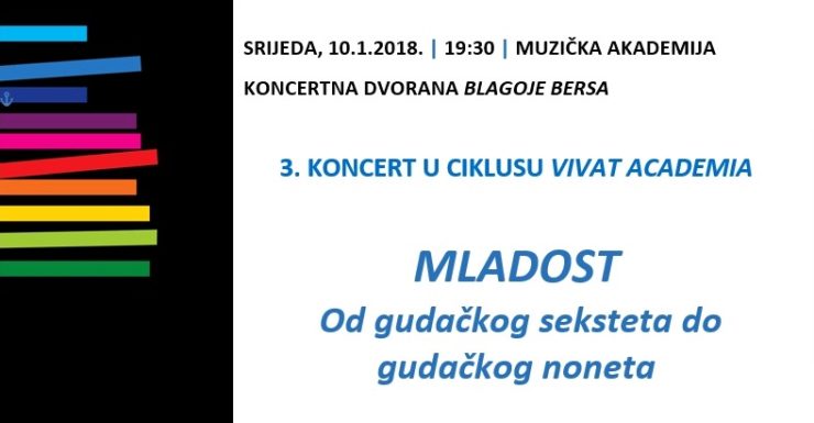U koncertnoj dvorani Blagoje Bersa na Muzičkoj Akademiji u Zagrebu u srijedu 10. siječnja 2018.godine održat će se koncert pod nazivom Mladost – od gudačkog seksteta do noneta iz ciklusa Muzičke akademije u Zagrebu – Vivat academia.