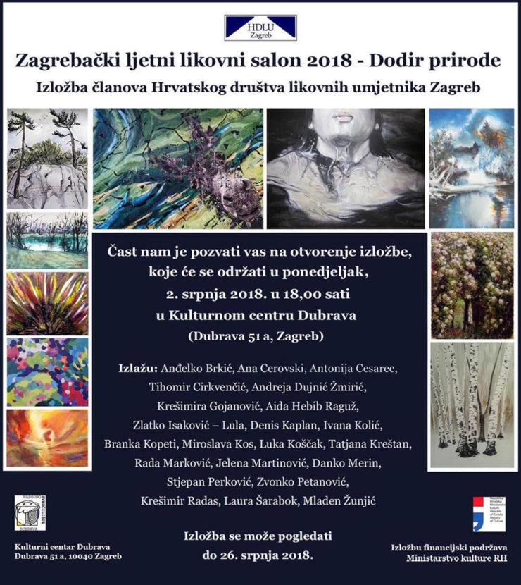 U Kulturnom centru Dubrava (Dubrava 51 a) , 2. srpnja u 18.00 sati otvara se izložba slika članova HDLU Zagreb pod nazivom Zagrebački ljetni likovni salon 2018 – Dodir prirode.