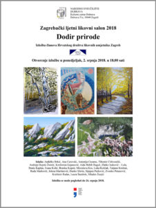 Zagrebački ljetni likovni salon 2018 u organizaciji HDLU Zagreb ove godine se predstavlja sa koncepcijom Dodir prirode i djelima 22 umjetnika, koji su u svojim slikarskim istraživanjima zabilježili osobne impresije iz prirode, njezine ritmove i mijene, godišnja doba i elemente, kao i bića koja prirodu nastanjuju uz nas.