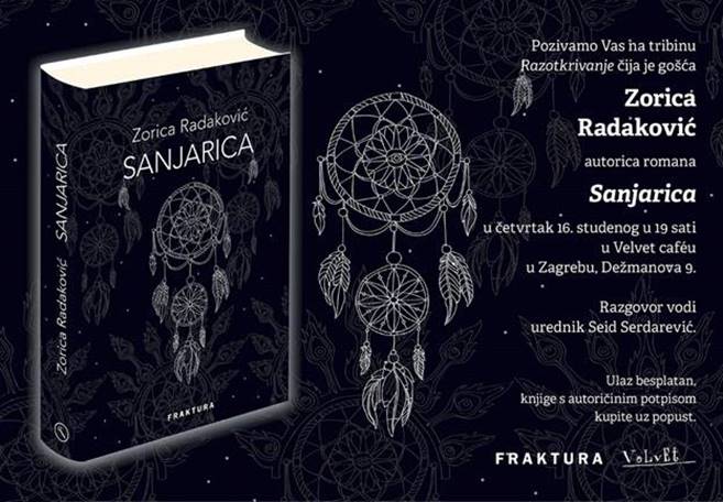 Nakladnička kuća Fraktura poziva ljubitelje književnosti u četvrtak 16. studenog 2017.godine u 19:00 sati u zagrebački Velvet café gdje će se održati tribina Razotkrivanje s pjesnikinjom i spisateljicom Zoricom Radaković.